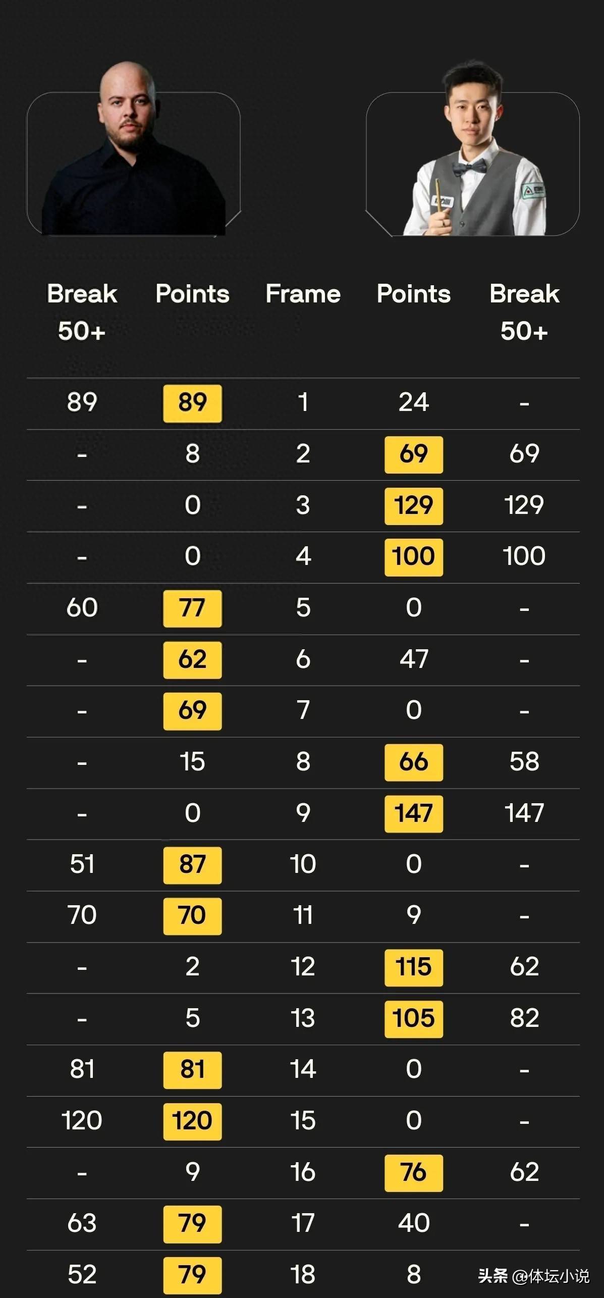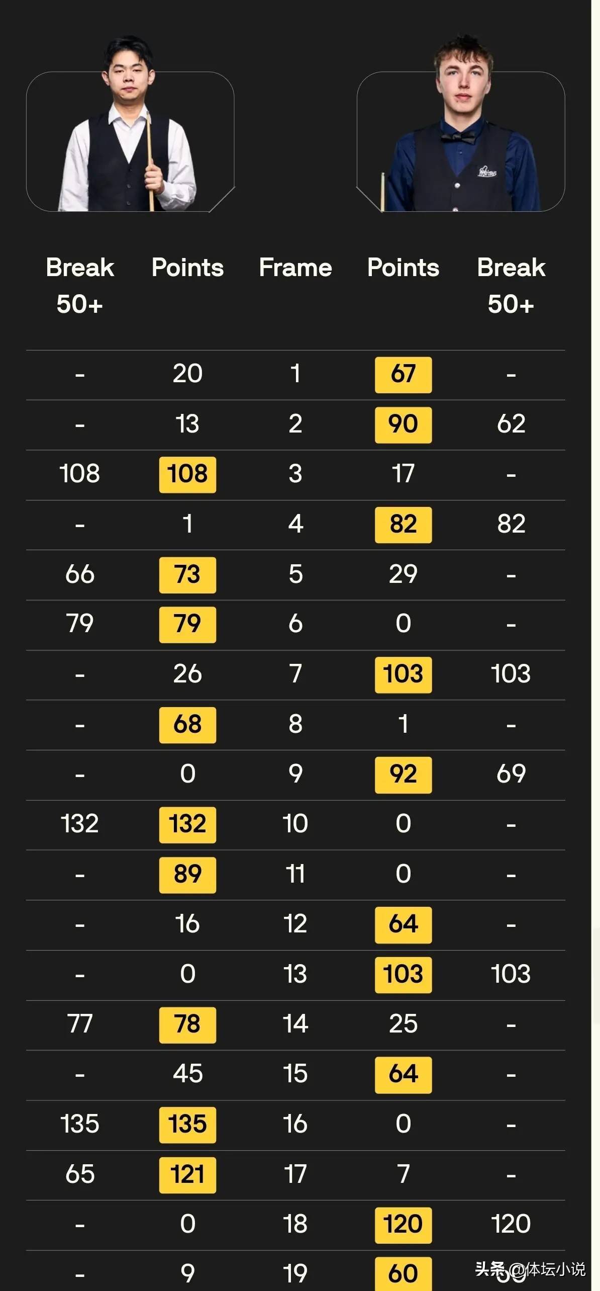 常冰玉对阵布雷切尔。布雷切尔是世锦赛冠军,虽然近两年状态低迷,不过其实力是有的,只要认真起来上限非常高。结果两人上演了进攻大战,打的是大开大合,各种单杆致胜,第一阶段常冰玉状态稍胜一筹轰出三杆破百和两杆50+,以5-4领先布雷切尔。第二阶段两人继续展开对攻,各自再赢两局,常冰玉一度以7-6领先。不过随后的比赛变成一边倒,布雷切尔准度犀利,上演了闪电4-1的进攻高潮以10-8击败了常冰玉晋级第四轮,这个结果也很正常,不过常冰玉四大赛两杆147拿到了巨额奖金也是可以接受的!