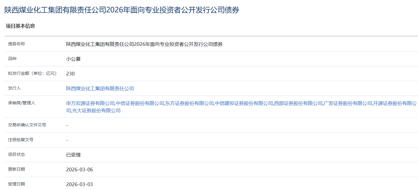 【大河财立方消息】3月6日,陕西煤业化工集团有限责任公司2026年面向专业投资者公开发行公司债券项目获上交所受理。